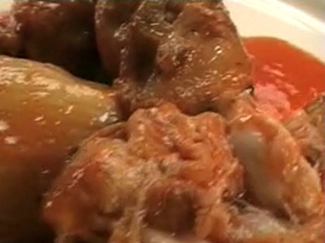 Рецепт приготовления мяса кролика.Состав:мясо кролика, белое вино, томатная паста, масло, соль, перец, шампиньоны, лук, чеснок. Язык: Русский