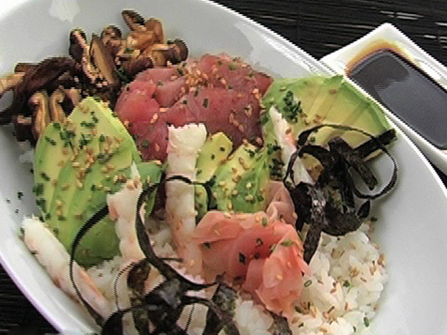Блюдо, в котором морепродукты и овощи приготовлены и разложены на рисе для суши.Состав:тунец — 50 гр;креветки — 4 штуки;нори — 1 лист;рис — 100 гр;шитаке — 4 штуки;авокадо — 1/2 штуки;кунжут, зеленый лук, гари — по вкусу. Язык: Русский